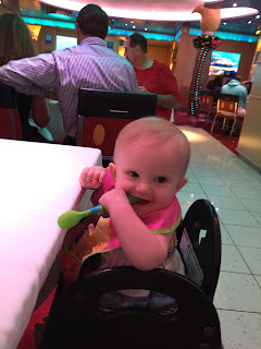 If you have never been on a Disney Cruise, each night you eat in a different restaurant (there are 3). The first night we were assigned Animator's Palette. It is the most modern/fun atmosphere of the 3. The pictures on the wall are actually TV's and Crush from the movie Finding Nemo swims around from TV to TV and talks with the guests. They servers also do a little skit with the guests and Blakely had a good time participating in that. For dinner I had the Lobster pasta purses for an appetizer, an orange & beet salad, filet mignon for my entree, and a white chocolate & milk chocolate cheesecake. All of the food was really good. Delainey was not pictured in any of the dinner pics because she was too busy playing in the kids area. We got her a hot dog, pizza & fries from one of the 24 hour places after the show and sent her to play instead of sitting through a long dinner. They also made some pureed food for Blakely each night which was an added nice touch of them going above and beyond.